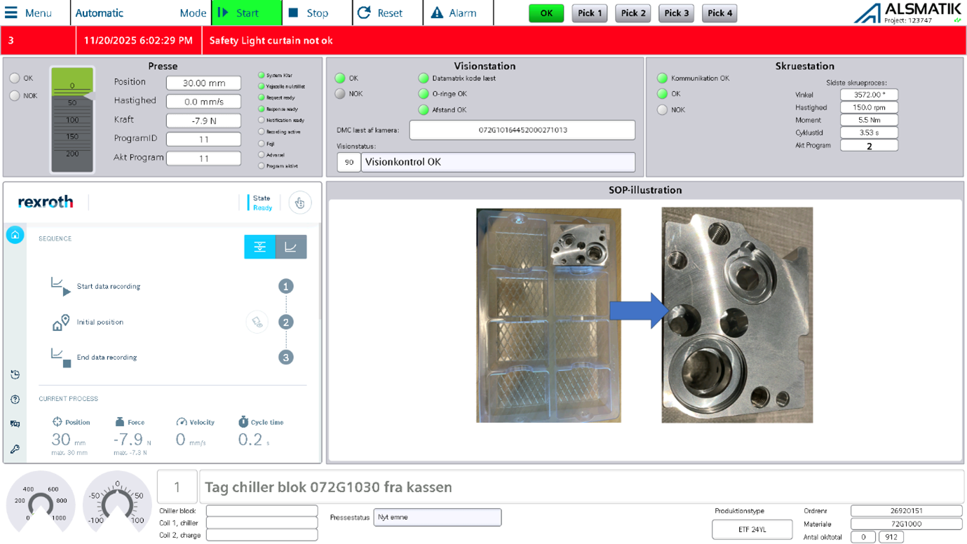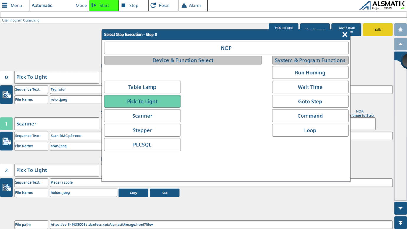 Opsæt sekvensen ved at indtaste en instruktionstekst til operatøren, vælg ønsket trinfunktion (f.eks. pluklampe, stregkodescanner eller evt. automatisk pressesekvens), tilføj illustration i form af billede, tegning eller video, som vises i det pågældende sekvenstrin.